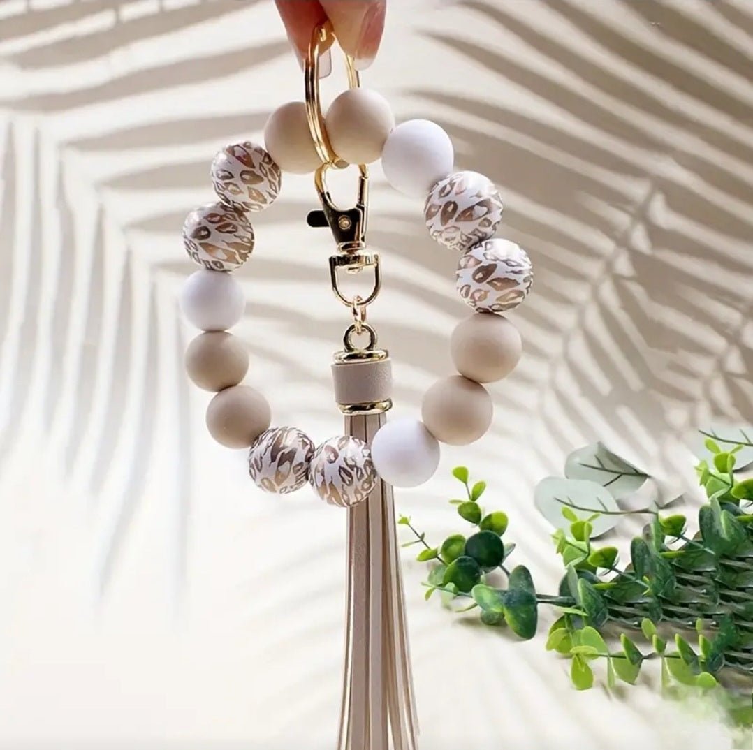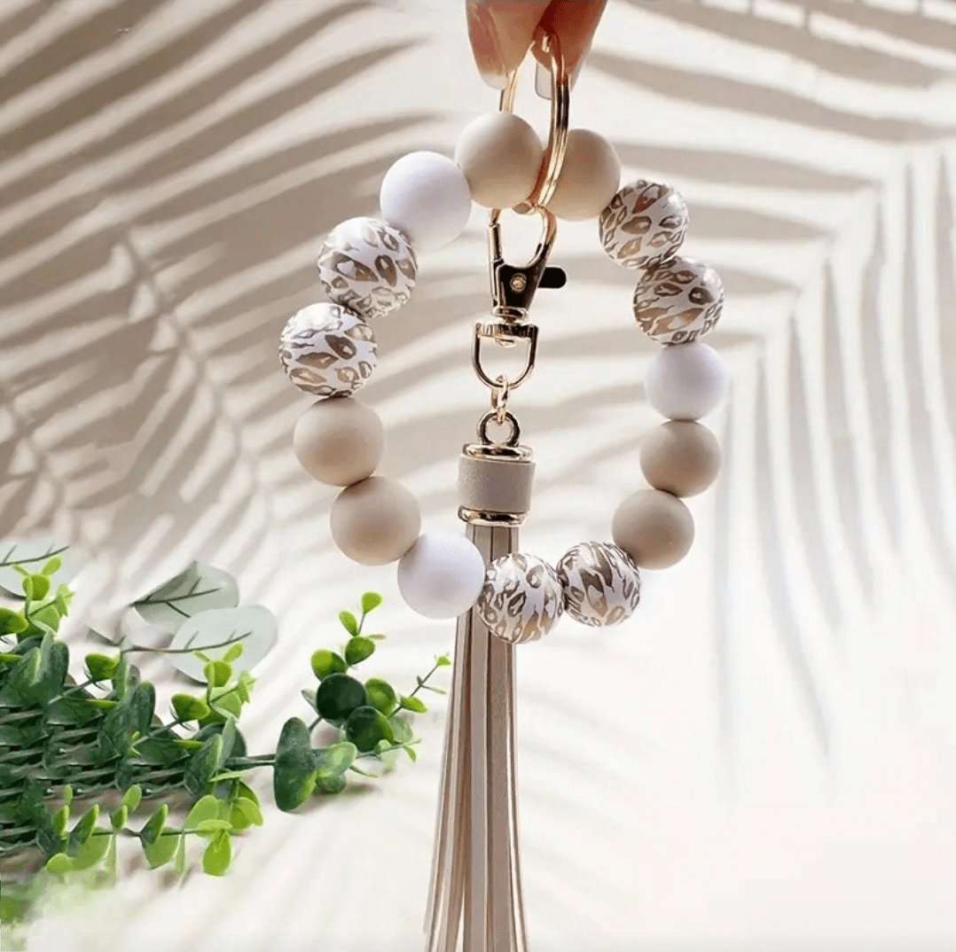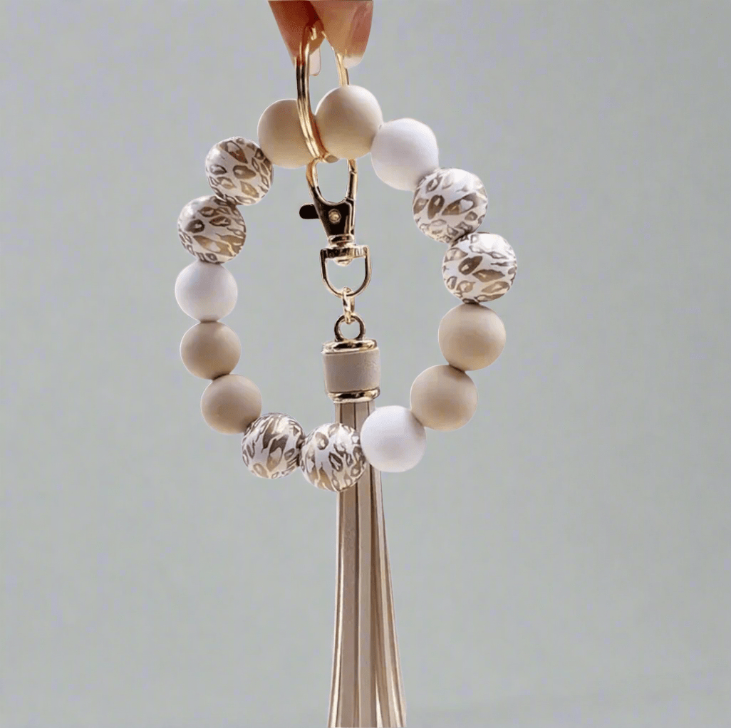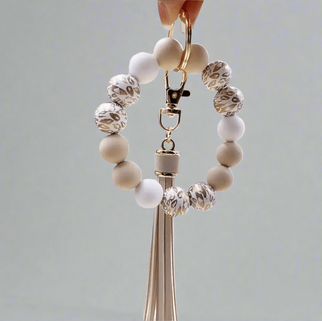 Add a touch of wild style to your everyday essentials! This soft gold and beige wristlet features large beads for comfort and flair, keeping your keys close, accessible, and fashionable wherever you go.